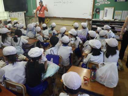 今日は、岩倉川に生き物探しに行きます。まずは、注意事項をしっかり聞きます。
