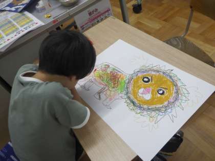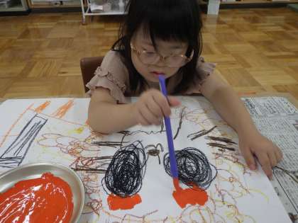 お話しの絵に取り組んでいます。自分の気に入ったシーンを想像しながらパスや絵具を使って描いています。今日は登場人物の表情を考えながら描きました。