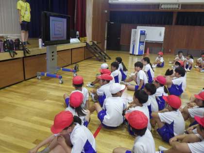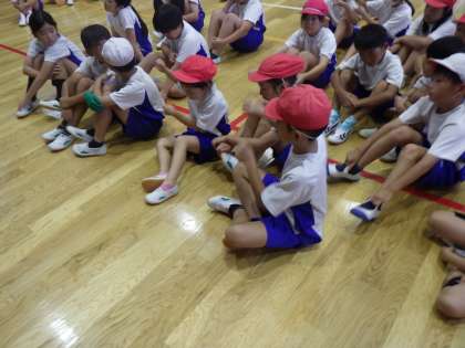 次に、隊型移動について詳しく話を聞きました。話を聞きながら、イメージして体を動かしている子もいました。