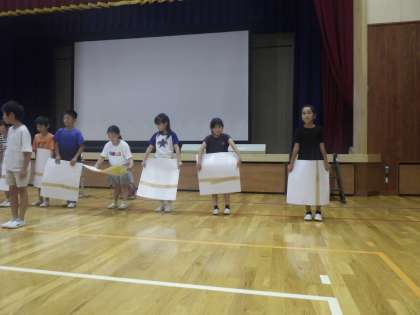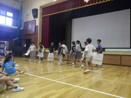 「みんなが主役でスマイル」のスローガンを全校児童で作った企画について説明しました。