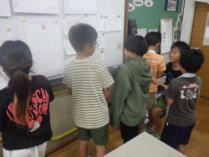 「太陽は東から南を通って西に向かう」「かげは太陽の反対側にできる」「日向の温度は日陰の温度より高い」など交流を通してたくさんの気づきがありました。