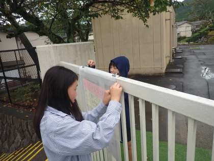 登下校でみんなが見られるように、校門と南門にはられています。