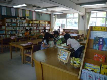 今日は,とってもよい天気。朝から,子どもたちは元気いっぱい。中間休みが始まると,運動場に繰り出します。少々の暑さもなんのその。運動場は大にぎわい。その一方で,図書室では読書を楽しんだり,本を返したり借りたり…。高学年の図書委員さんがそのお世話をしてくれています。また,職員室前の水槽を興味深けにじっくりと見つめる子どももいます。そんないろいろなことをして休み時間を過ごしている子どもたちですが,休み時間終了前の音楽が流れると,教室への移動開始。そうです。3時間目がもうすぐ始まります。みんな元気にがんばっています。
