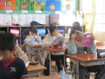 掃除時間が終わると昼読書です。掃除が終わった人から本を選んでいます。毎日5分ですが、少しの積み重ねが大きな成果につながります。