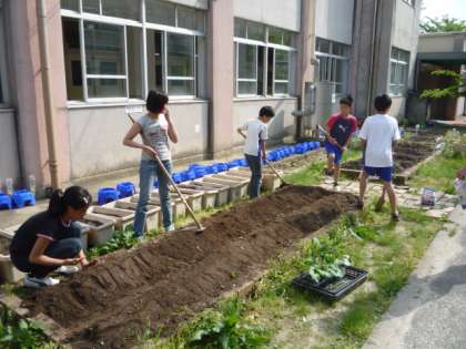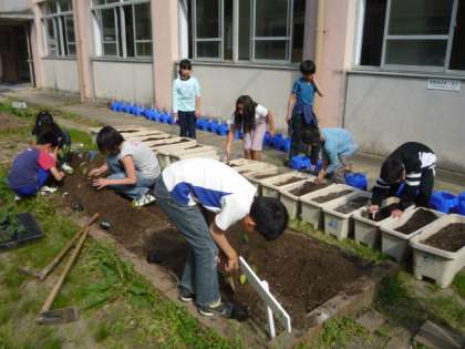 今日は朝から雨降り。子どもたちにとっては,思いっきり体を動かすことができない,不完全燃焼気味の一日となりました。しかし,畑の作物にとっては,恵みの雨です。プール横の農園に植えた植えたさつまいも。中庭には,朝顔やヒマワリ。昨日,環境委員会で植えたなすびやきゅうりの苗。早く芽を出してほしいなあ…。