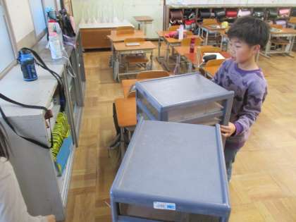 掃除時間のこと。物をどかしてホコリやゴミがないか見ています。ゴミは見えないところにたまるものです。棚の下、ありましたか?