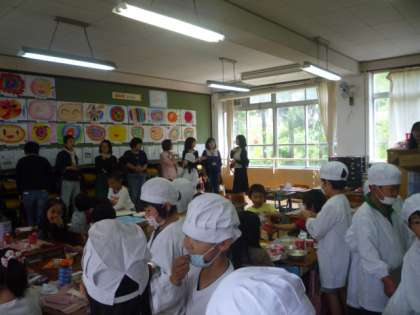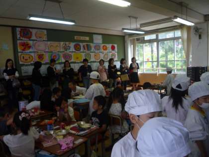 給食試食会には,1年生の保護者25名の参加がありました。はじめに,栄養教諭(明徳小学校兼務)から,学校給食と子どもの食生活についてお話させていただきました。その後,1組・2組に分かれ,給食の準備や食べているところを参観いただきました。そして,最後には,みなさんで給食を食べていただき,和やかなうちに給食試食会を終えることができました。尚,PTA本部の方々には,配膳をご協力いただきまいした。