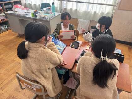 国語科の学習の様子です。1人がひみつの言葉カードを持ち、他のグループの子達はその人が、持っているひみつの言葉を自然と口にするように話を続けました。