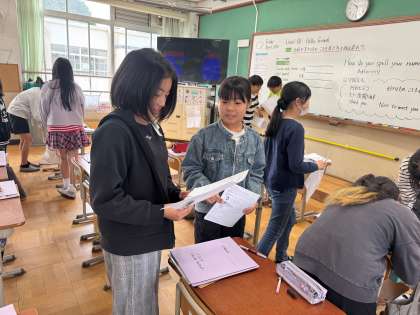 Unit 1 Hello,friends! の学習を進めています。自己紹介をする中で、友達の名前のつづりをたずねる表現を使っています。子ども達は自然とリアクションをしたり、笑顔で話したりとコミュニケーションの基本を大切にしている様子が見られました。