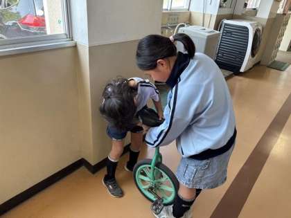 昼休みに3年生が管理用務員さんに一輪車の高さを調整してもらおうとしていました。