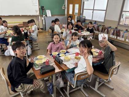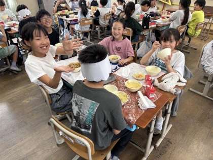 山の家のシェフ係で活躍したコック帽が、今日の給食時間にも登場!