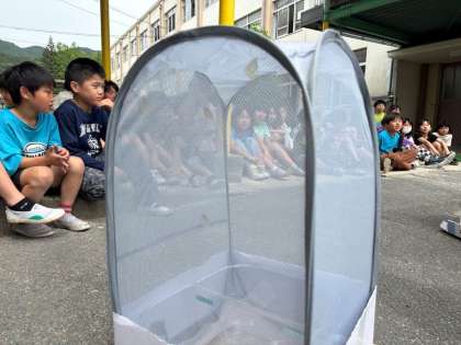 羽化したチョウを外に放つために,バイバイ会をしました。