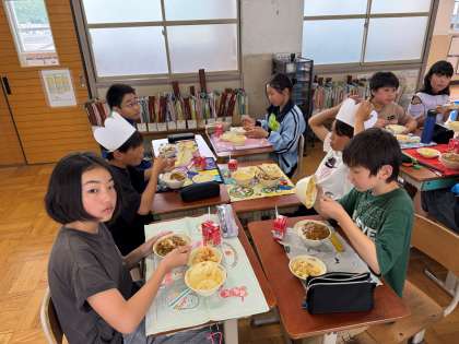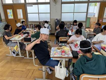 5年生の給食時間。花背山の家が終わった今でも、シェフ帽をかぶって給食を食べている姿があります。それだけ、山の家が楽しかったことがとても伝わります!