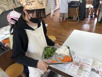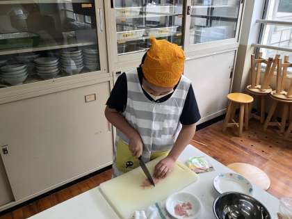 調理実習を行いました。朝食にもピッタリな野菜炒めです。昨年の経験が生かされていて安全にも気を付けながら包丁を使って具材を切っていました。