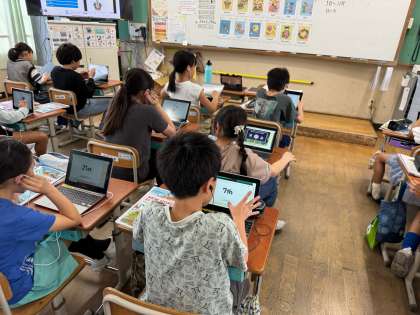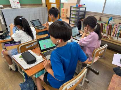 外国語科の学習では、個別で課題にチャレンジする時間を設けています。単元末のゴールを見据えたり、本時のめあてを達成したりするために、今の自分と向き合い、自分に合う練習をしています。聞くだけで終わらず、聞いたら声をだして確認するという練習をしている子もいます。