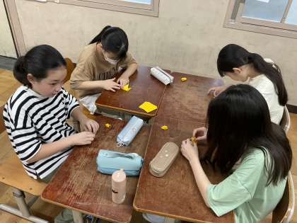 修学旅行に向けての準備を進めています。広島の平和記念公園では千羽鶴を寄贈することになりました。早速きまったグループでお互いに教えあいながら折り紙で鶴を折っています。