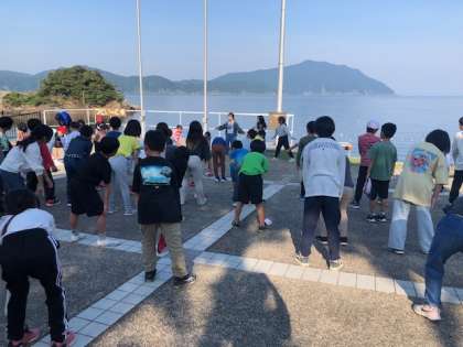 朝の集いでは、ラジオ体操や学校紹介をしました。岩倉北小学校の紹介をリーダーの2人がしてくれました。
