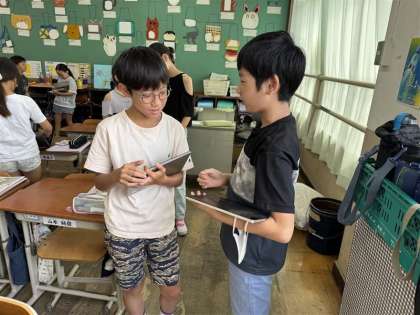 5年生外国語科U3 Can you play dodgeball?の単元末のゴールとして、「意外な一面を伝え合って、お互いのことをよく知ろう」と設定し、今日はその最後の時間でした。質問をし合ったり、一歩踏み込んで内容を伝えることで、より互いの意外な一面が知れたようです。1学期で使える表現も増えました!