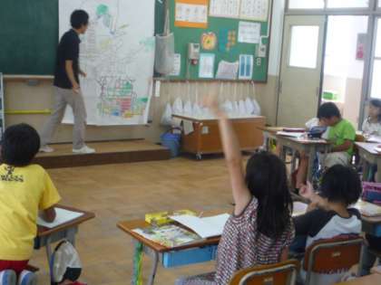 岩倉北学区の大地図を作りました。今のままでは相当わかりにくいというのが実情です。さて,何をどのようにすれば,分かりやすい地図になるでしょうか?子どもたちからは,様々な考えが出されました。○店を色をつけて表す。 ○記号で表す。 ○色や記号の説明を地図の端に示す。 ○地名を明記する。 さて,今度はどんな地図ができるかな…?