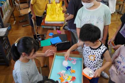 クラスによってブースの種類やブースの作り方も異なりますが、どこのお店もとても楽しそうでした。1年生の真剣な顔と笑顔がたくさん見られました。5年生が1年生にそっと寄り添っている姿が素敵です。