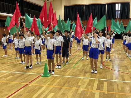 演技で披露するフラッグの練習に入りました。昨年度も使用していたことで見通しをもちながら学習に取り組むことができています。