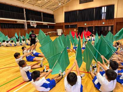 今日は組体操からウェーブ、フラッグと通してやってみました。一連の流れでやってみると子ども達も達成感を感じていたようです。