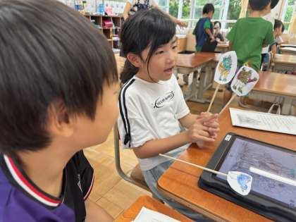 隣のクラスのお友達にペープサートを使って,選んだお話の大好きを伝えました。