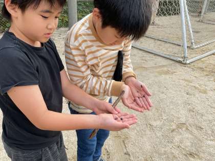 秋の生き物の様子を観察しました。春から観察してきたサクラやダンゴムシなど、生き物グループ別で活動しました。春や夏と比べて数が少ない生き物もいることに気づいて、やっと見つけたときは大喜びでした。ヒョウタンの実も小さかったけれど触ったり大きさを測ったりしました。