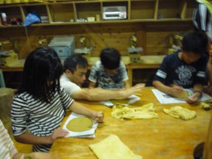 師匠に学んだ技術を生かして,お皿づくりを始めました。なんといっても,粘土の中に空気を入れないこと,空気が入ると,素焼き段階で爆発し,その周りに置いてある友達の作品も潰してしまうことにもなりかねません。だからといって何回も何回も手のひらで粘土をこねていると,体温で粘土が乾燥してしまうそうです。てきぱきと進めていくことが大切のようです。途中,わからない事や相談を師匠としながら,全員オリジナルお皿を製作しました。このあと,素焼き・本焼きを経て完成品となります。どんなお皿に仕上がるか楽しみです。