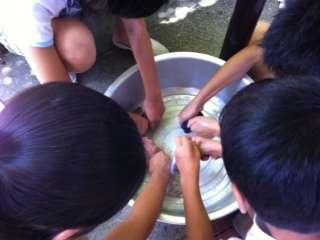 今日は,太陽が大きく応援してくれた天気でした。その下で,自分たちが履いていた靴下を洗濯しました。一方は手洗いで,もう一方は洗濯機で。洗濯量を量り,必要な水の量を計算するところからしました。手洗いのタライは水がどんどん黒くなる一方で,靴下はみるみるきれいになっていきました。さぁ,手洗いと洗濯機,乾いた後の汚れの落ち具合やさわり心地はどうでしょう!?比べて,それぞれの良さを次の学習で確認しようと思います。