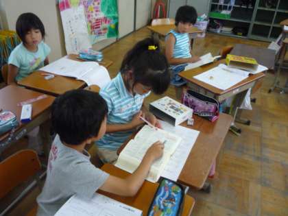 3年生は,サマースクールに多くの子どもたちが参加しました。子どもたちは,わからない漢字や言葉があると国語辞典を使って調べながら学習を進めました。わからないところは,教科書で調べたり,辞書を使ったりしながら,自学自習の習慣化を図る学習形態で進められていました。