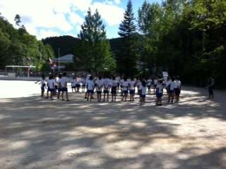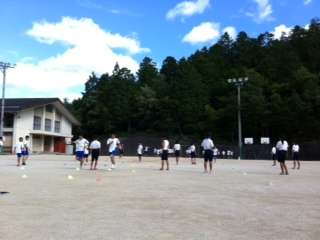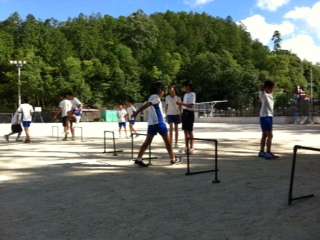 朝から太陽が照りつける中,今朝も洛北中学校陸上部の先輩と洛北中学校の先生に指導をしていただきました。ハードルを使ってのトレーニング,ミニコーンを使ってのリズムよく走るトレーニングなどなど,朝からしっかり頑張りました。6年生もがんばっていますが,4・5年生も負けてはいません。たくさんの先輩を前に,積極的に走っています。中学生には頑張っている後輩たちを見てもらい,小学生は立派になった中学生に憧れる。小中連携の目指す姿の一つが見えました。