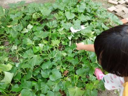 3組では,毎日朝の会で畑に水やりをします。今日も水やりをしていると…。「あっ!先生見て〜〜!」と指を指す方を見てみると,なんと!!!さつまいもが顔を出していました!!大きなさつまいもで驚きました!おいも掘りをするのが楽しみです☆