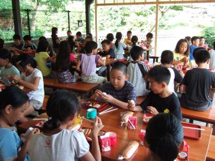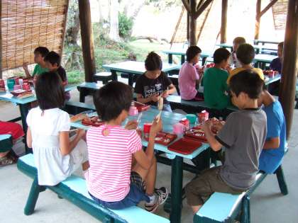 みさきの家での食事は基本的に野外で食べました。場所は,芝生広場近くの東屋と野外炊事場のテーブルでした。毎回,食事係が自分のグループのメンバーの食事を用意し,みんなでそろって食べました。野外炊事場の横の深谷水道を行き来する漁船に手を振ったり,いろいろ話をしたりしながら楽しく食べました。