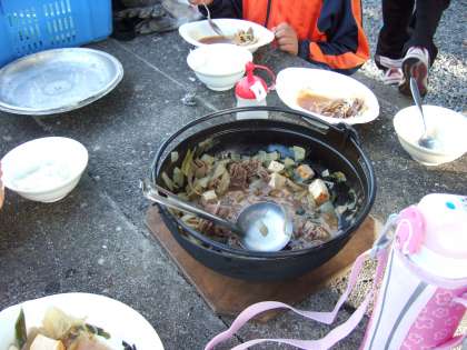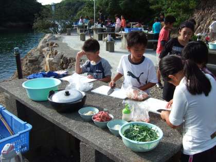まず,食器や鍋を洗いました。次に玉ねぎ,ねぎ,焼き豆腐を包丁で切りました。4年生は調理をしたことのない子も多いので心配しましたが,どのグループも上手にできました。次にかまどで火をおこしました。新聞を軽く丸めて置き,その上に火のつきやすい細い薪を置きました。さらにその上に太い薪を置き,着火の準備をしました。なかなかうまくつかない事も多いのですが,この日は全てのかまどの火がすぐにつきました。あとは鍋で煮るだけです。しばらくするとふたと鍋の隙間から湯気が上がり,いいにおいが漂い始めました。「できた!」と大喜びで鍋をテーブルに運び,グループごとに食べました。どのテーブルからも「おいしい!」の声が聞こえました。初めての野外炊事は,大成功でした。