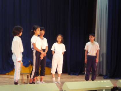 リハーサルのラストは,6年生の太平洋戦争を振り返り,平和の尊さを考えた「あの 青い空」です。小学校生活のラストを飾るこの劇をやり遂げるため,6年生は今日まで,全力を尽くしてきました。9月に行なった運動会でも,クライマックスは6年生の団体演技(組体操)でした。今回も,平成24年度岩倉北小学校学芸会のトリを担います。ご期待ください。