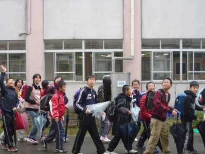 朝から寒い日となりましたが,6年生は燃えています。中庭で,他の学年の子どもたちに「行って来ま〜す。」をして,宝ケ池に向かって出発しました。今日は,予選会チーム(10人)と交歓会チーム(4人・5人)合わせて3チームが参加します。先ほどまで小雨が降っていましたが,今は少し晴れ間も覗いてきています。がんばれ,6年生!