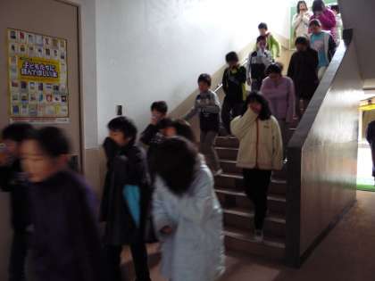 「おさない・はしらない・しゃべらない・もどらない・ていがくねんゆうせん」これは,有事の際に避難する時の決め事です。今日は,地震発生による火災を想定し,左京消防署・岩倉北分団・学校運営協議会安全福祉部会の方々のご協力を得て,今年度3回目の避難訓練を実施しました。地震音→校内放送(安全対策)→非常ベル(火災発生)→校内放送(避難誘導指示)という順番で,277(本日は10名欠席)名の児童が避難しました。「お・は・し・も・て」の通り,真剣な態度で避難し,講評では,消防署員の方から褒めていただきました。