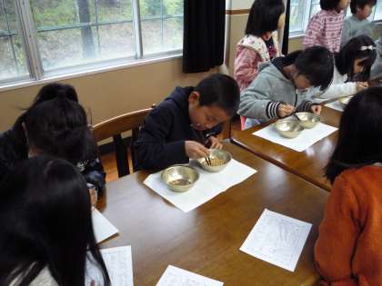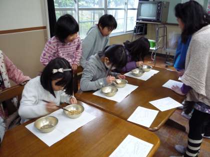 給食週間の一つの取組でもある「まめつかみ大会(健康委員会主催)」を,今日は3年生を対象として実施しました。中間休みが始まるや否や多くの3年生が,ランチルームに集まりました。ルールは,30秒で何個の豆を別の容器に移し替えられるかです。しっかりとした箸の持ち方をマスターし,一つでも多くの豆を移し替えます。みんな真剣なまなざしで30秒の戦いに挑んでいました。