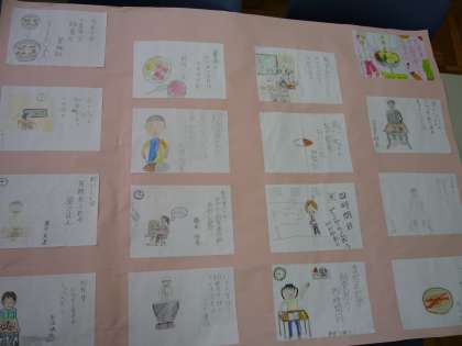 6年生は,毎日の給食への思いを,五・七・五にまとめました。「あとちょっと 給食を待つ 四時間目」「昼ごはん いつも給食 ありがとう」「給食に 感謝をこめて いただきます」「ヒレカツの サクサク感が たまらない」「おいしいな 心をこめた 給食は」この他にも多くの作品ができあがりました。