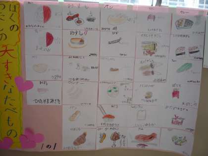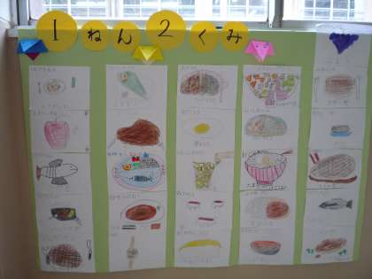 給食週間に,1年生みんなに「大好きな食べ物」を尋ねてみました。1組・2組毎に集計してみると,人気があった順は次のようになりました。〔1組〕パン・おすし・肉料理・魚料理・カレー・野菜サラダ…,〔2組〕肉料理・おすし・魚料理・たまご料理・カレー・スパゲティ…。他には,やきいも・スープ・もち・グラタンなどもありました。一人一人が好きな食べ物をカードにし,南校舎1階に掲示しました。