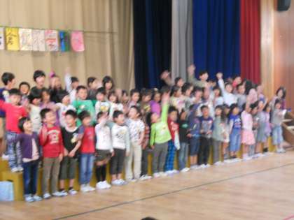 まずは,1年生の入場です。6年生と手をつないだ1年生がフラワーロードを通って舞台の前の雛壇に座っていきました。1年生に気をつかいながら歩く6年生がとても頼もしく見えました。次に,各学年からの学校を紹介する出し物のプレゼントです。歌やリコーダーの演奏や寸劇と各学年とても工夫された出し物で,1年生もとても喜んでいました。3年生からは「紙ペッタン」という手作りのおもちゃをプレゼントされました。そして,1年生からも歌のお返しです。元気のいい歌声が体育館に響き,岩倉北小学校の一員になる喜びを表わしているようでした。