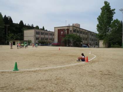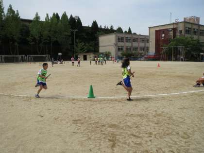 運動場でリレーを行いました。