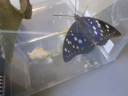 子どもたちは初めてサナギから成虫になった蝶を見た興奮と,そしてオオムラサキという日常ではなかなか見ることができない蝶を見た興奮とで,時間を忘れてずっと見入っていました。