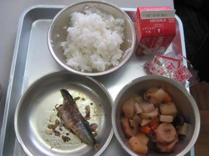 今日の給食は、節分の行事献立でした。メニューは、ごはん・牛乳・いわしの梅煮・関東煮・いり豆でした。古来より節分には、「巻きずし」や「いわし」や「豆」を食べ、無病息災を願う風習がありますが、給食にもこれにちなんだメニューでした。