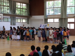 はじめの出し物は4年生です。体が反るほどの大きな声で、1年生にたくさん教室の名前と使い方を教えてくれました。