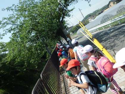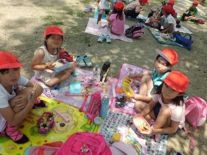 入学してはじめての遠足。とても暑い中でしたが,笑顔いっぱいで楽しむことができました。行きは2年生のお兄さんお姉さんと手をつないで,一緒に仲良く歩きました。