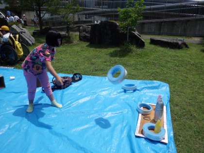 屋外学習では,空気砲や銀マットのおもちゃで遊んだり,アカハライモリやナマズ,ザリガニなどの生き物と触れ合ったりしました。