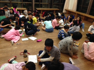 1日を振り返る「まとめの会」も最後になりました。自分たちで進め,反省と明日のめあてをいつでもきちんと考えられています。褒めるところしかないぐらい,全ての活動をきちんとしています。きもちのよいあいさつ,てきぱきとした行動,お互いを思いやる声かけ・・・花背山の家の所員の方々にもたくさんお褒めの言葉をいただいています。4日目の晩で、つかれも出てきている頃ですが,多くの子どもたちが,ここでの生活の問いかけに対して「まだここにいたい!」と,腕をしっかり伸ばして手をあげていました。たくましくなりました。一段と伸びた5年生軍団です。