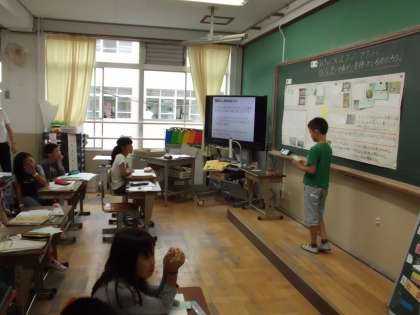 3年生は社会科でこれまで学習してきた,「商店のはたらき」のまとめの段階に入っています。自分たちで予想したことを元に,見学に行き,さらに販売の工夫をみつけてきました。資料を指し示しながら自分の考えを述べている姿はさすがです。